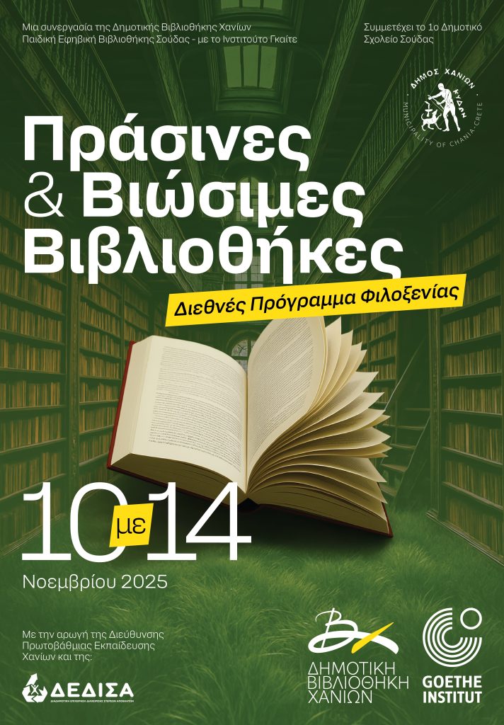 Δευτέρα 10 Νοεμβρίου 2025 (1η μέρα) Με επιτυχία πραγματοποιήθηκε η επίσημη παρουσίαση του Διεθνούς προγράμματος φιλοξενίας «Βιώσιμες Βιβλιοθήκες» του Ινστιτούτου Γκαίτε στη Δημοτική Βιβλιοθήκη Χανίων και την Παιδική – Εφηβική […]