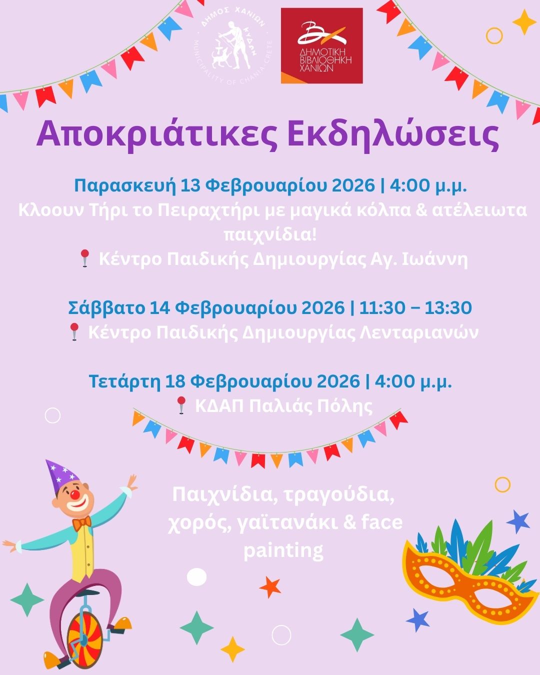 Νέα προγράμματα φιλαναγνωσίας για μαθητές Α/θμιας Εκπαίδευσης στα Κέντρα Παιδικής Δημιουργίας Αγίου Ιωάννη & Λενταριανών της Δημοτικής Βιβλιοθήκης Χανίων. Η Δημοτική Βιβλιοθήκη Χανίων συνεχίζει τα προγράμματα για μαθητές στα Κέντρα […]