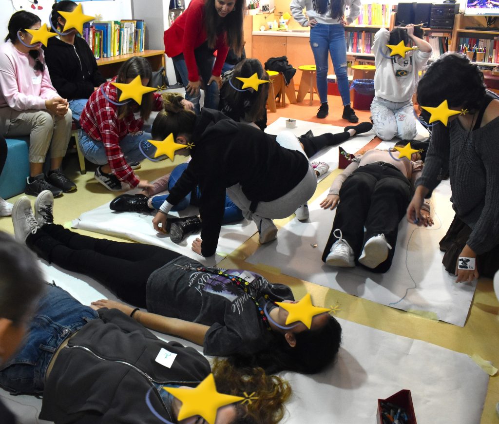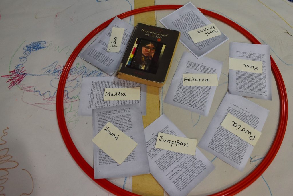Τα παιδιά έφτιαξαν μικρά βιβλιαράκια με τη μέθοδο zine, μοιράστηκαν τις σκέψεις τους, περπάτησαν ο ένας πάνω στις γραμμές που όρισε ο άλλος, γέμισαν τη βιβλιοθήκη με φράσεις της Άλκης και έφυγαν με μια λέξη δική τους, γραμμένη με λευκή μπογιά στο τελευταίο δισέλιδο του βιβλίου που έφτιαξαν!