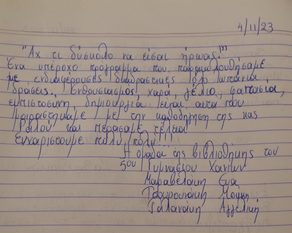 Η Παιδική – Εφηβική Βιβλιοθήκη Δημοτικού Κήπου τη Δευτέρα 4/12/2023 υποδέχτηκε 24 μαθητές και από τις τρεις τάξεις του 5ου Γυμνασίου Χανίων μαζί με τις καθηγήτριες τους , που είναι υπεύθυνοι για τη δανειστική βιβλιοθήκη του σχολείου τους.