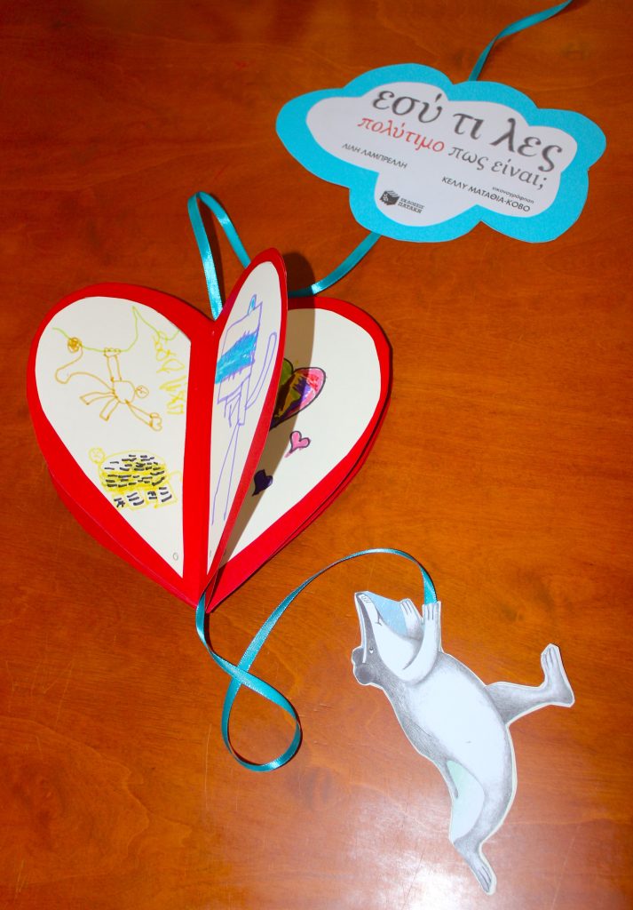 Τους καλοδέχτηκε, τους τραγούδησε, τους είπε την ιστορία του, και χόρτασε με φωνούλες, γέλια και ζωγραφιές απ’ τα παιδιά. Χορτάτος λοιπόν και δυνατός, κίνησε για το σχολειό τους κουβαλώντας τα δικά τους “πολύτιμα”!