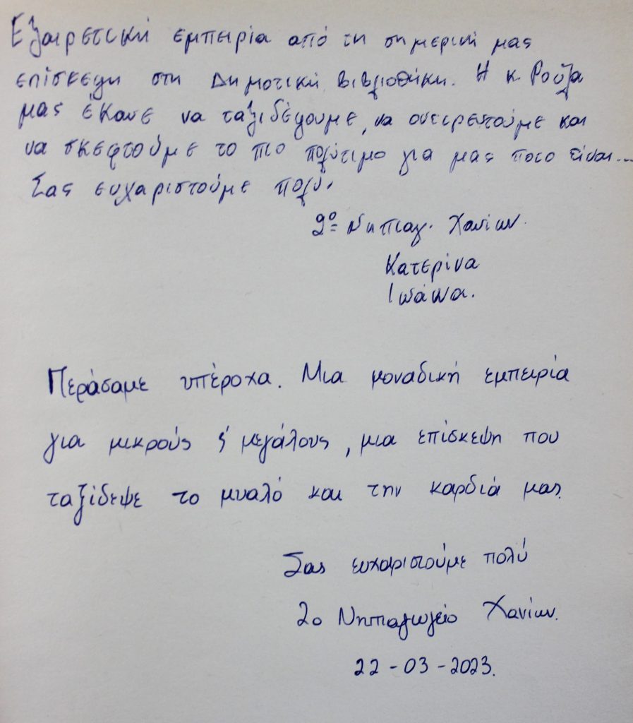 Τα παιδιά του 2ου Νηπιαγωγείου Χανίων επισκέφθηκαν την Δημοτική Βιβλιοθήκη Χανίων με τις δασκάλες τους, για να συναντήσουν τον φίλο μας τον ασβό. Τον ήρωα του βιβλίου της Λίλης Λαμπρέλλη, “Εσύ τι λες, πολύτιμο πως είναι”, από τις εκδόσεις Πατάκη.