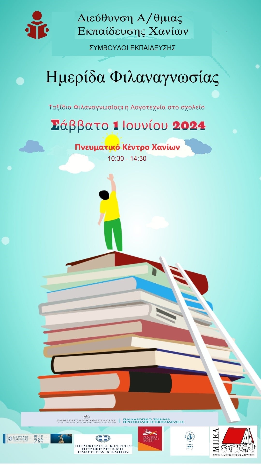 Το Σάββατο 1 Ιουνίου 2024 θα πραγματοποιηθεί Ημερίδα φιλαναγνωσίας με τίτλο “Ταξίδια φιλαναγνωσίας: Η λογοτεχνία στο σχολείο” από τη Διεύθυνση Α/θμιας Εκπαίδευσης Χανίων, στο Πνευματικό Κέντρο Χανίων.